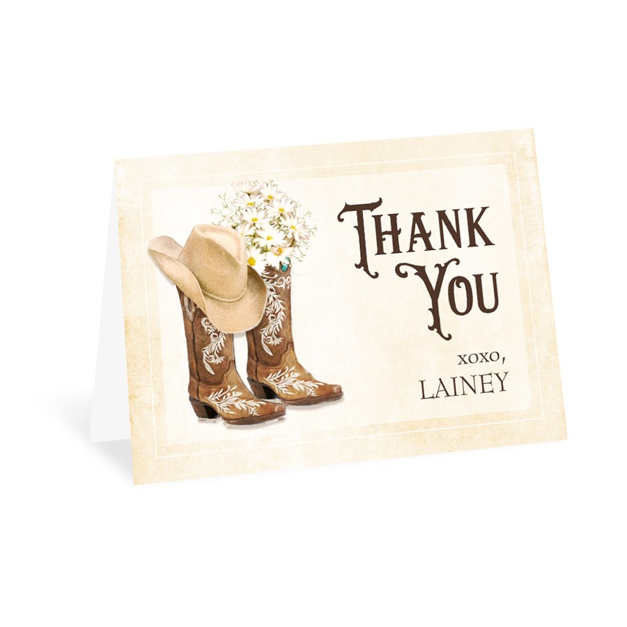 Say thank you in country western style with these Bridal Boots Bridal Shower Thank You Cards. These cheap but chic note cards are a perfect way to say thanks after your bridal shower. The words "Thank You" are printed in a country-inspired text on the front in your choice of color. You can add your custom text in any font or color to customize these cute, cowgirl note cards.