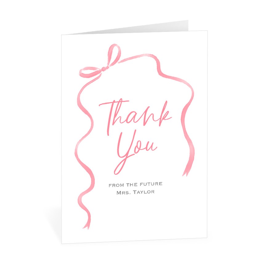 This Blushing Bride bridal shower thank you card can be personalized in any colors you choose. The words "Thank You" are featured on the front with a delicate bow frame. An affordable choice, you can add any text you choose, to create a one-of-a-kind, bridal shower thank you card.