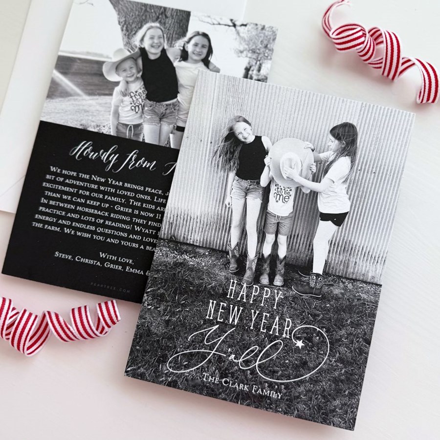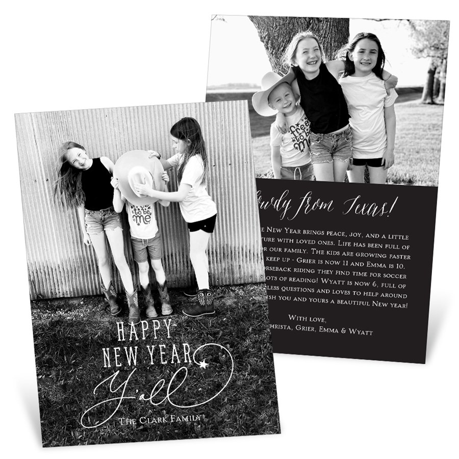 Ring in the New Year with festive Southern flair! The New Year Y’all New Year Card features bold, customizable typography that reads “Happy New Year Y’all,” with room for a standout photo and your own color palette. It's a fun, laid-back way to celebrate the season of fresh starts. Personalize this photo New Year card, and create a custom look with endless layout, photo, design and text options.