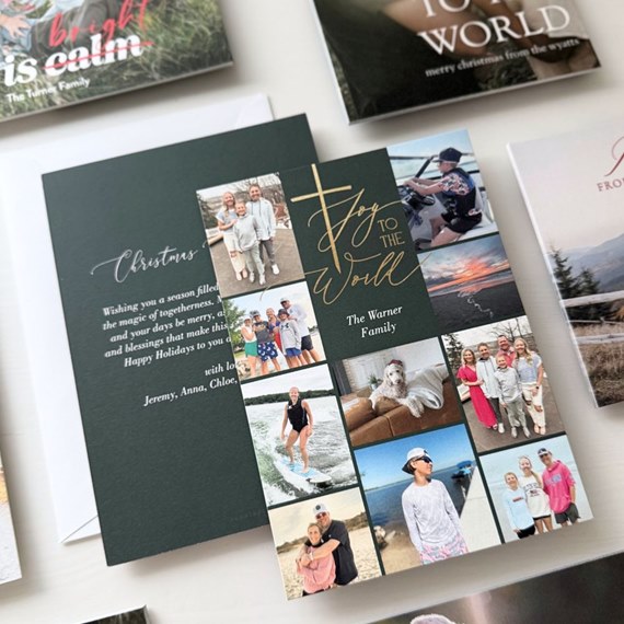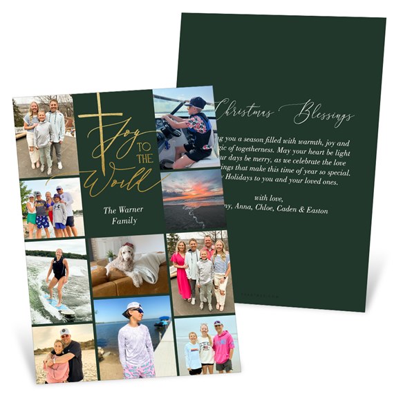 Celebrate the season with a card that’s full of joy—and photos! The Joyful Holiday card features ten image spots framed by the uplifting phrase “Joy to the World” and a cross design in shimmering gold ink. Customize the background and font colors to create a meaningful keepsake. Personalize this photo Christmas card, and create a custom look with endless layout, photo, design and text options.