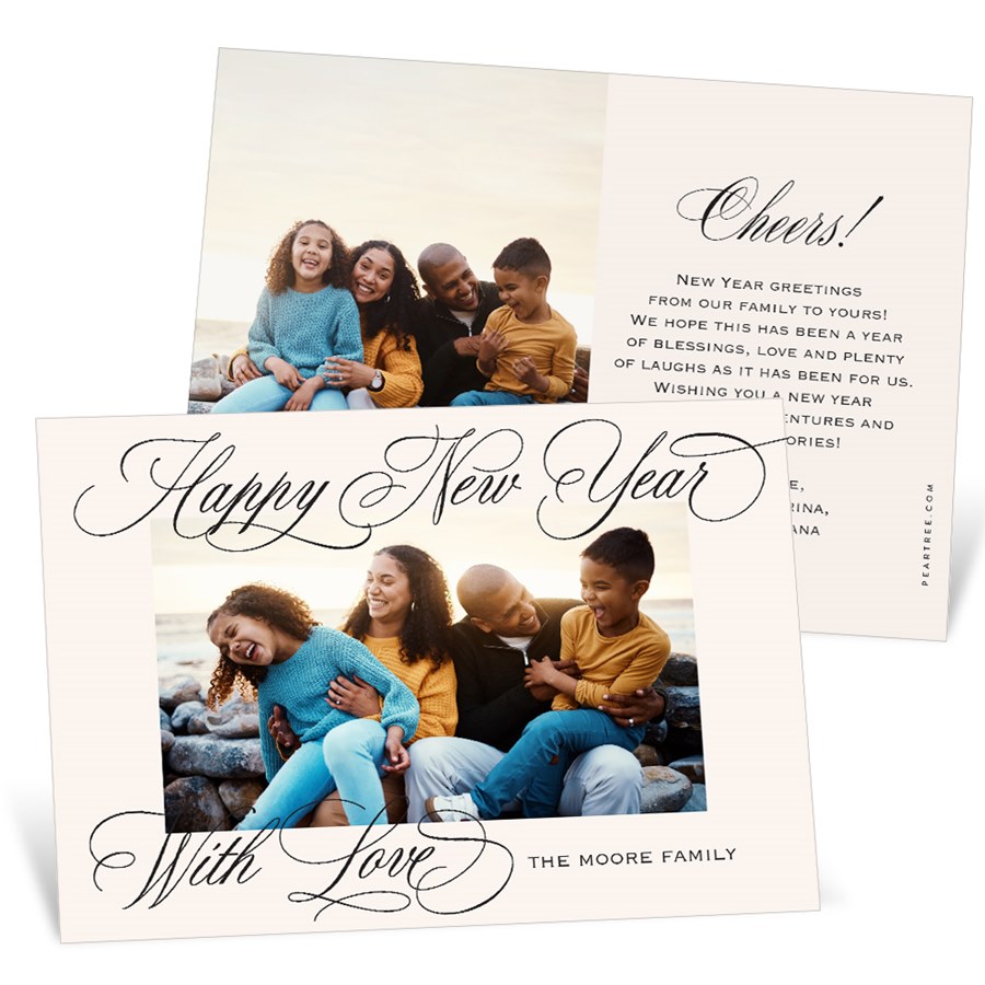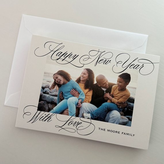 Ring in the new year with elegance and warmth. This New Year Flourish New Year card features a graceful “Happy New Year With Love” message in customizable colors, along with your favorite photo. Personalize this photo New Year card, and create a custom look with endless layout, photo, design and text options.