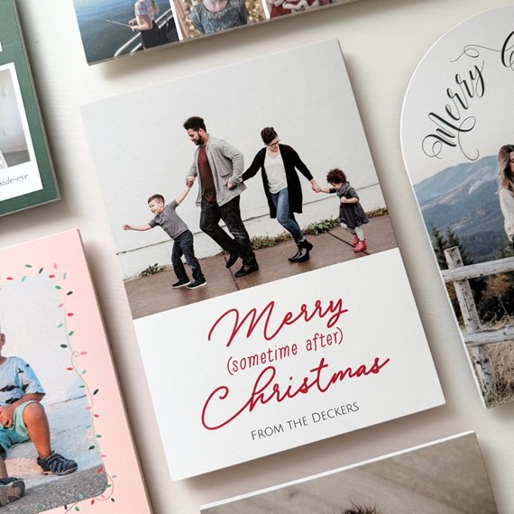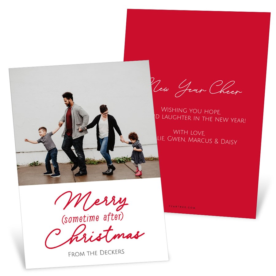Celebrate the season—fashionably late—with this charming After Christmas Merry (sometime after) Christmas card design. Perfect for families who run on their own holiday timeline, this card brings a dose of humor and a whole lot of heart. The playful phrase is paired with your favorite photo, making it a fun and relatable way to connect with loved ones, even if your cards arrive after the big day. Personalize this photo Christmas card and create a custom look with endless layout, photo, design, and text options.