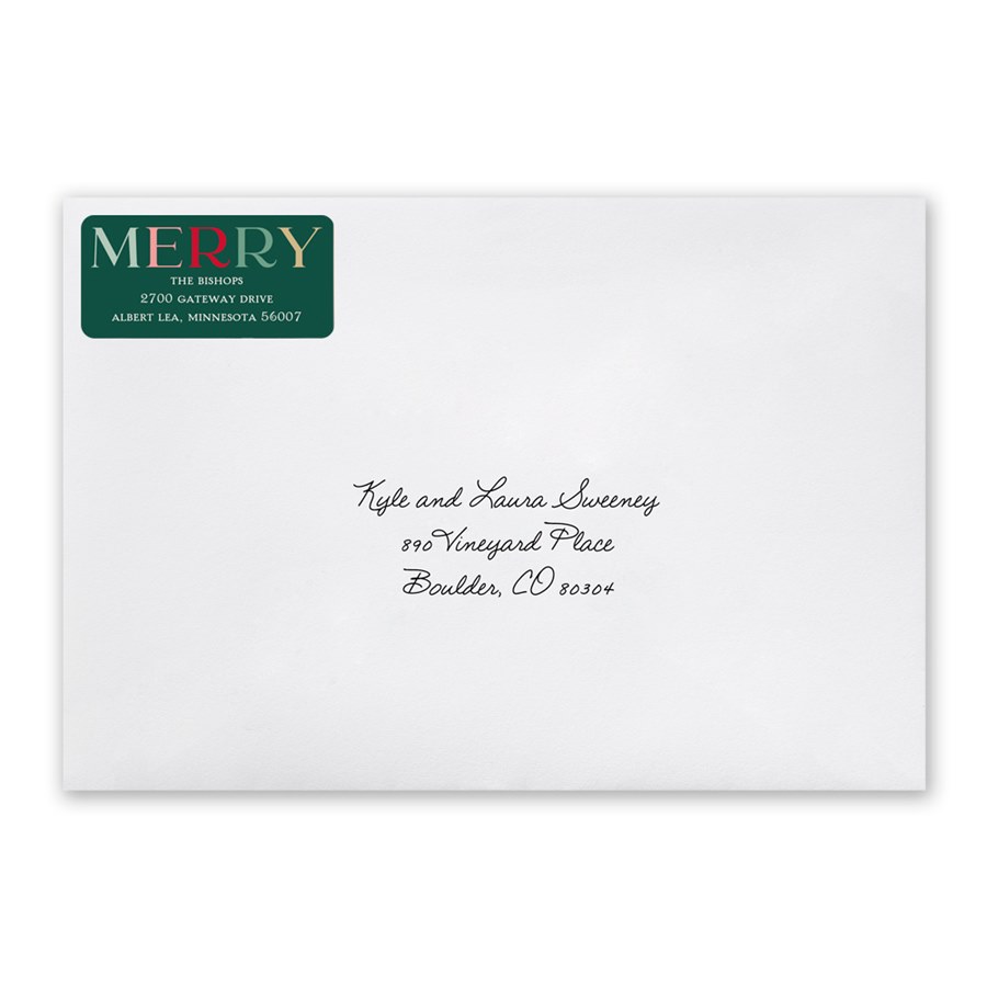 Spread holiday cheer right from the envelope with this festive return address label featuring the word “MERRY” in bold, playful lettering at the top. Easy to apply and designed to add a pop of holiday fun to every envelope, these labels bring personality and festive flair to your holiday mail.