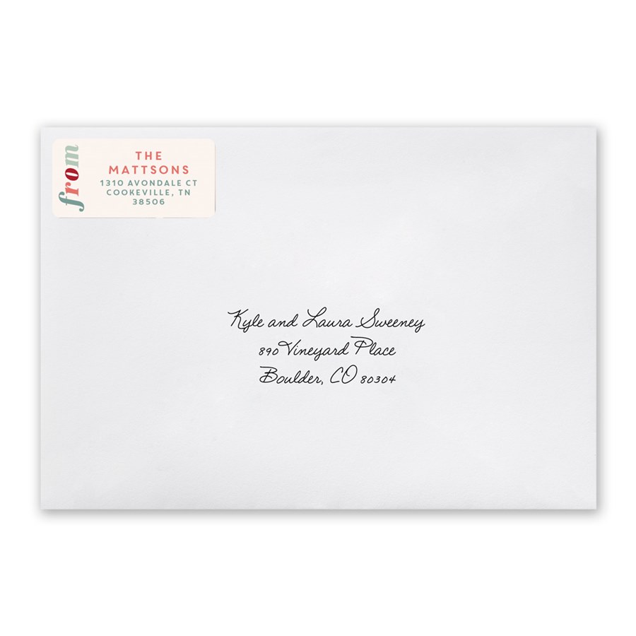 Spread holiday joy right from the envelope with this festive return address label featuring the word “from” in playful lettering along the side. Easy to apply and designed to add a pop of holiday fun to every envelope, these labels bring personality and festive flair to your holiday mail.
