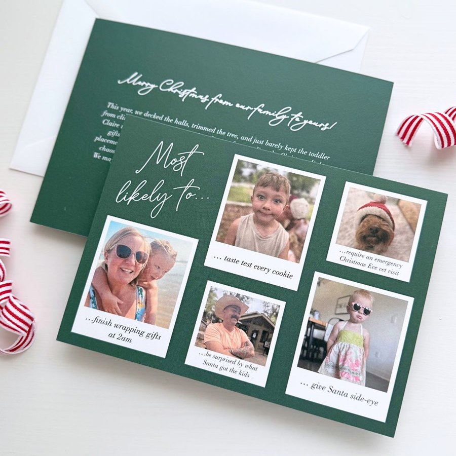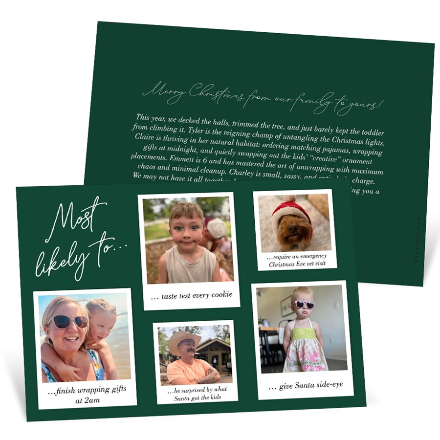 Add a playful twist to your holiday greetings with this Most Likely Christmas card. Showcase five family photos in a Polaroid-style layout and assign each person a light-hearted title—perfect for families with personality to spare. The text color and layout are yours to customize for a one-of-a-kind look. The front features the phrase "Most likely to..." in the color of your choice. Personalize this photo Christmas card, and create a custom look with endless layout, photo, design and text options.