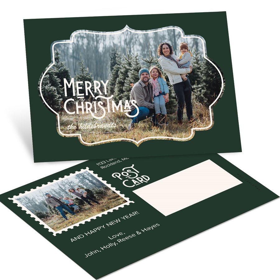 Nostalgic charm meets holiday cheer with this Vintage-inspired postcard. A crest-shaped frame surrounds your photo with “Merry Christmas” on the front, and a stamp-edge photo on the back completes the classic look. Personalize every detail to create a card that feels truly timeless.