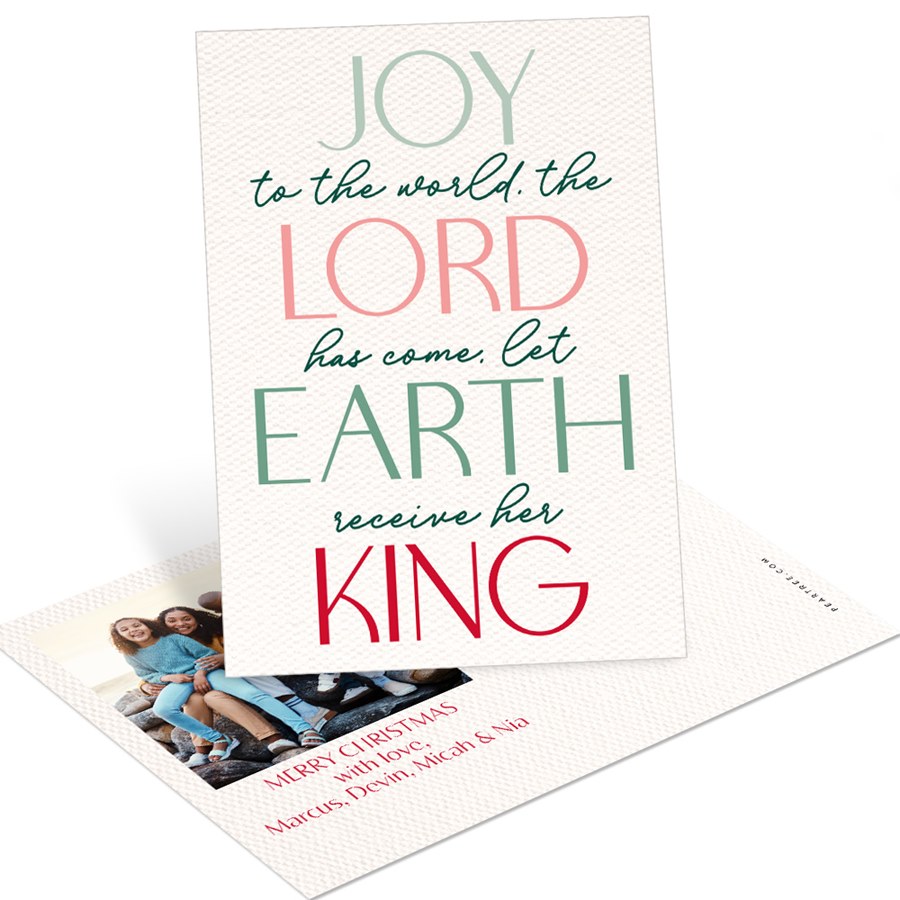 Celebrate the true meaning of Christmas with this faith-filled, Joy Has Come postcard. The front features the inspiring message “Joy to the World. The Lord has come. Let Earth Receive her King” in elegant type over a textured white background. Add a special photo and personal message on the back.