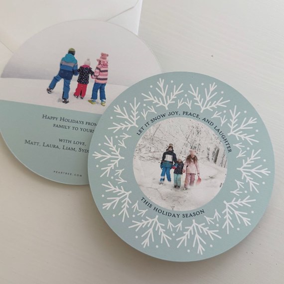 Celebrate the magic of the season with the Snowy Cheer Christmas Card. This round, two-sided design features a customizable snowflake surrounding your photo, with a joyful message that reads, “Let it Snow Joy, Peace and Laughter this Holiday Season.” Add a second photo and message on the back.
