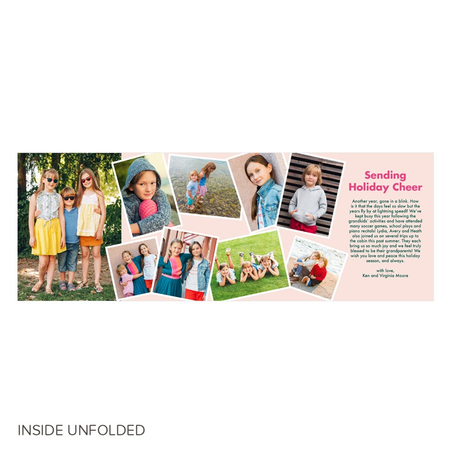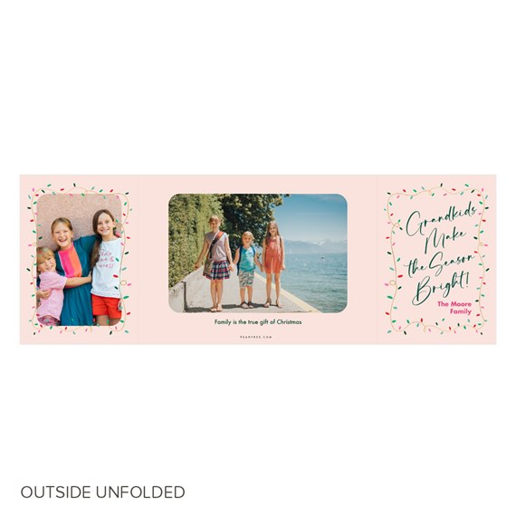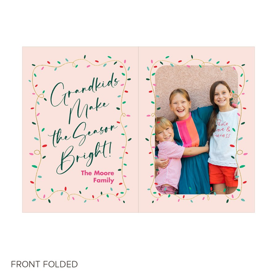 Let the grandkids steal the spotlight with this Grandkid Season Christmas Card! This cheerful gatefold card features the phrase “Grandkids Make the Season Bright!” accented with festive Christmas lights in digital gold ink. Add a front photo of your little stars, then fill the inside with nine more photos and your custom message. The back panel holds an extra photo and space for a personal note. Update the background colors to match your holiday style.