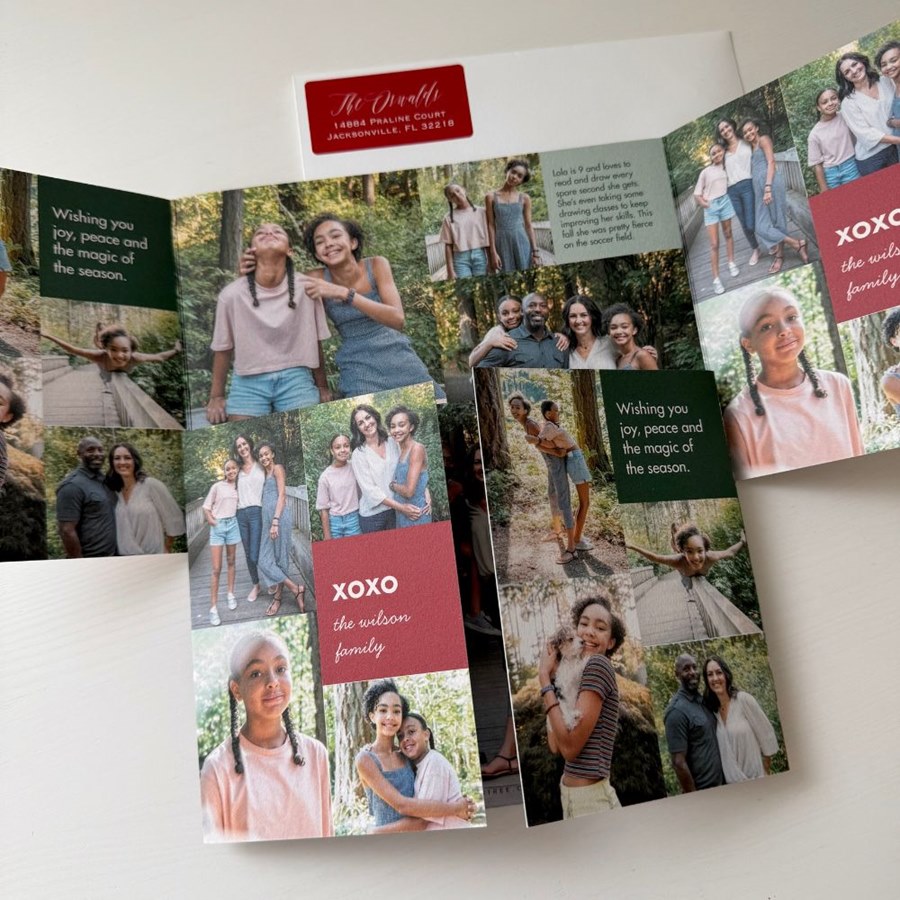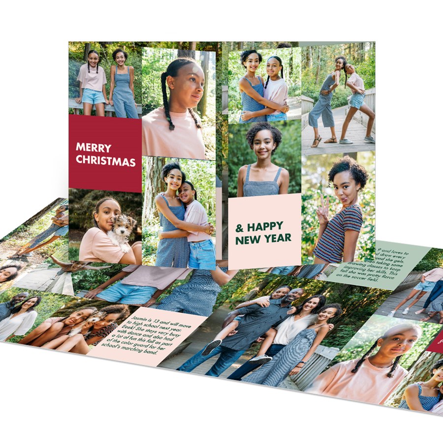 Bright, bold, and bursting with photos! The Color Blocked Christmas Card is a gatefold design with vibrant color blocks that highlight 21 of your favorite images—eight on the front, twelve inside, and one more on the back. Customize the colors and add your own greeting for a modern and personalized holiday hello.