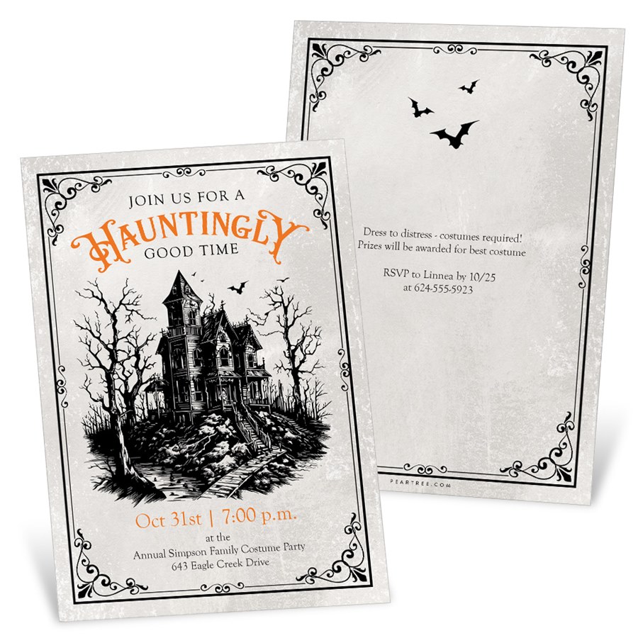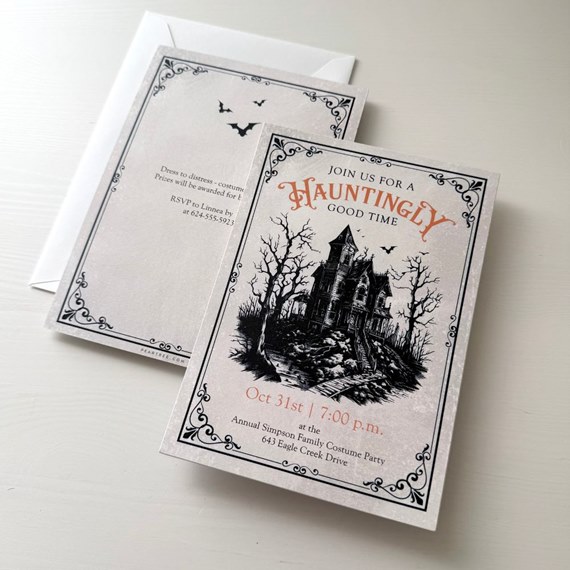 Throw a hauntingly fun bash with the Haunted Mansion Halloween Party Invitation. Featuring a spooky haunted house scene with bats and chilling details, this invite makes it clear: your party is the place to be. The back has plenty of space for your eerie event info to share with all your favorite monsters.