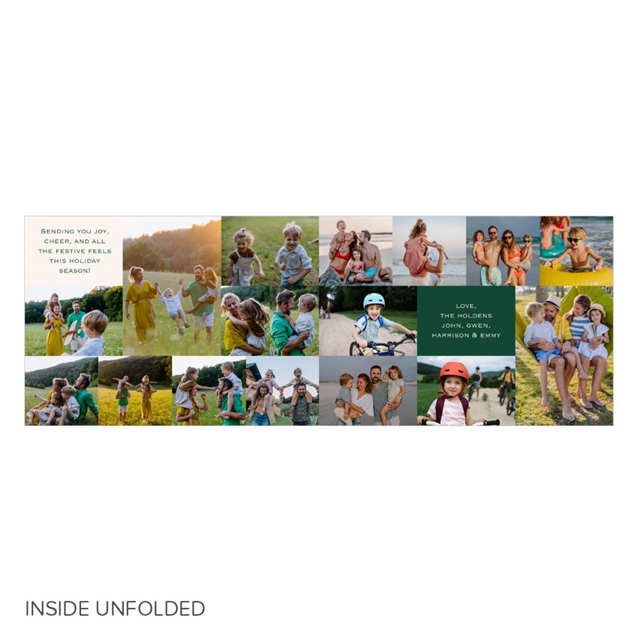 Go big on memories with the Merriest Collage Christmas Card, a photo-lover’s dream! The front features a collage of eight photos surrounding “Merry Christmas,” and the inside includes 16 more photo spots with color block accents and space for your captions. Add one last photo and message on the back to wrap it all up.