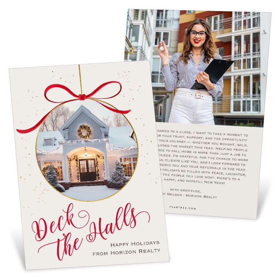 Celebrate the season with the Festive New Home Business Holiday Card—an ideal photo holiday card for realtors looking to connect with clients in style. Your photo appears inside a golden ornament topped with a festive red ribbon, accented by printed gold speckles for the rich look of digital gold ink. The cheerful “Deck the Halls” greeting sets a joyful tone, while customizable colors and multiple back layout options let you share your holiday message, contact details, or even extra property photos—perfect for staying top-of-mind as clients dream of their next home.