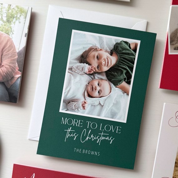 Share your holiday joy and introduce your bundle of joy with the Extra Love Photo Holiday Card — the perfect choice for new parents announcing a new baby at Christmastime. The front features the sweet phrase “More to Love this Christmas” alongside your favorite photo, beautifully framed to highlight your little one. The back offers a fully customizable layout, giving you space for another adorable picture or a heartfelt message. Personalize every detail—from the wording to the frame style and background colors—to create a baby announcement holiday card that’s as unique as your growing family.