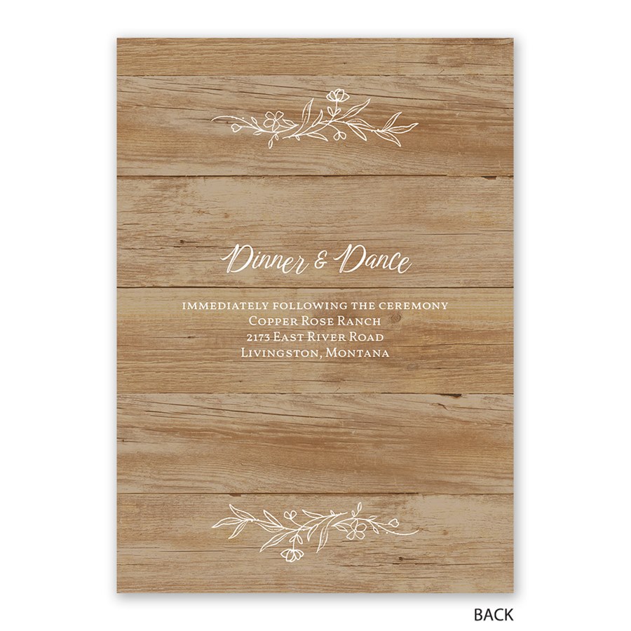 This Simple Rustic wedding invitation is the perfect combination of rustic charm with boho vibes. The woodgrain background and floral detail lends rustic romance styling to the first glimpse of your wedding day. All the text on these invitations can be changed to the fonts and wording of your choice. You can update the color of the floral artwork to match your wedding style. The back features room for additional details for a personal touch. Matching digital RSVP cards are available.