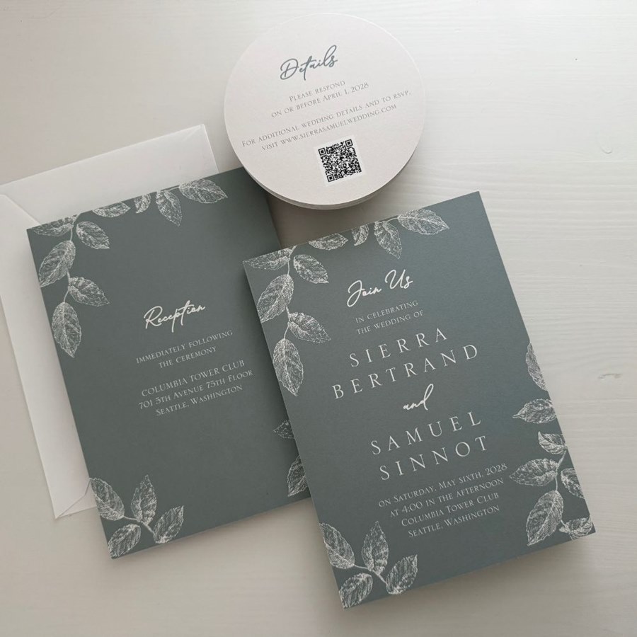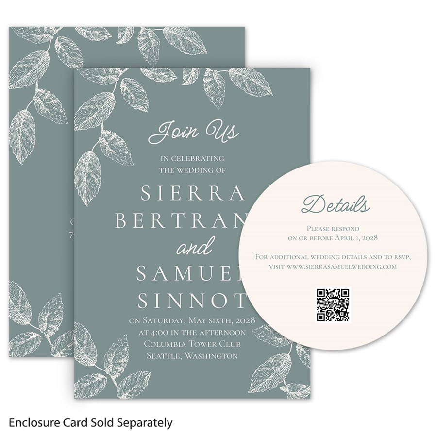 Beautiful sketched greenery frames your wedding invitation wording beautifully on this Sketched Leaves Wedding Invitation. This greenery-themed invite can be customized in the color palette you choose. These two-sided wedding invitations are printed with your invitation wording on the front and your choice of wording on the back (reception details shown). Matching digital RSVP cards are available.