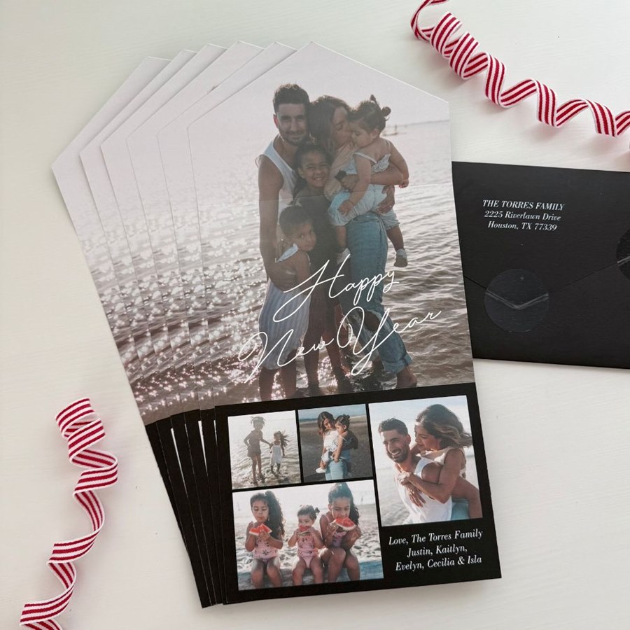 Ring in the year ahead with this Scripted New Year Seal & Send New Year Card. The front showcases the phrase “Happy New Year” in elegant script, which you can update in the color and placement of your choice. This design includes space for five photos, letting you recap your best memories before starting fresh in January. As a Seal & Send card, no envelope is needed—just fold, seal, and mail. Personalize with custom text, colors, and your return address for a festive New Year’s card that’s both stylish and convenient.