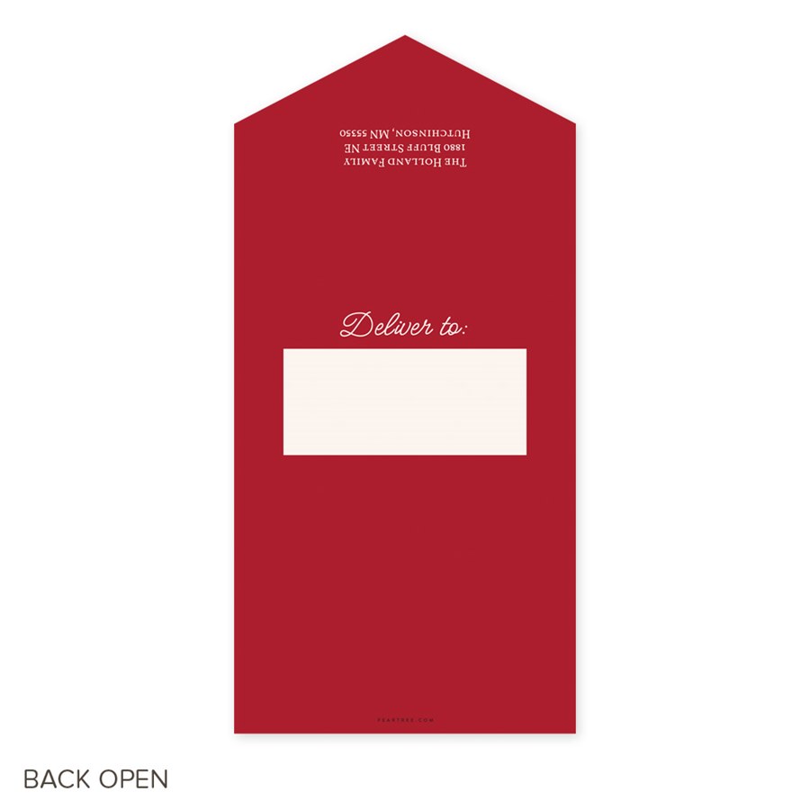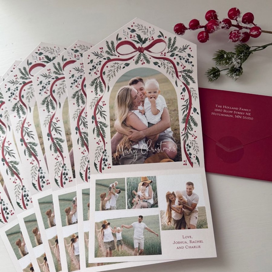 Celebrate the natural beauty of the season with this Botanical Seal & Send Christmas Card. This elegant design features botanical greenery with a red ribbon bow over your main photo, framed in a graceful arch. The front also includes space for four additional photos, letting you share family moments in style. Customize text and background colors to create a card that feels personal and polished. With its convenient Seal & Send format—no envelopes required—this greenery Christmas card makes sending holiday joy easy and beautiful.