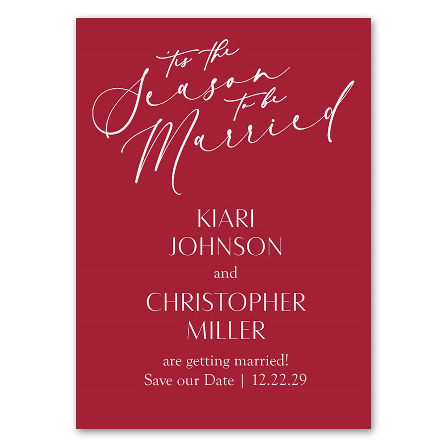 Announce your joyous occasion with the Wedding Season Save the Date Magnet. Featuring the festive phrase "'tis the season to be married," this magnetic save the date is perfect for holiday or Christmas-themed weddings. Customize all colors to match your wedding palette and set the tone for your special day.