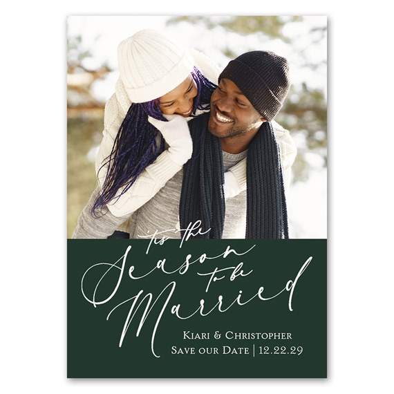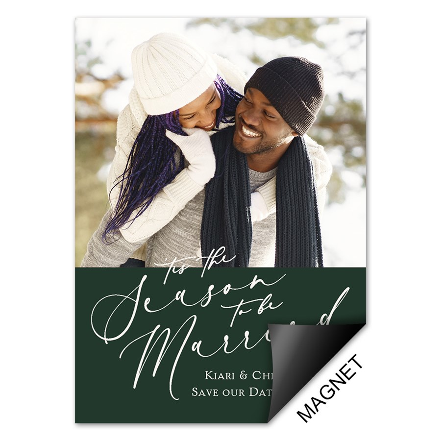 Celebrate your upcoming nuptials with this Photo Season Save the Date Magnet. Showcasing your photo alongside the festive phrase "'tis the season to be married," this magnet is ideal for Christmas or holiday weddings. Personalize all colors to match your wedding aesthetic and share the joy of your special day.
