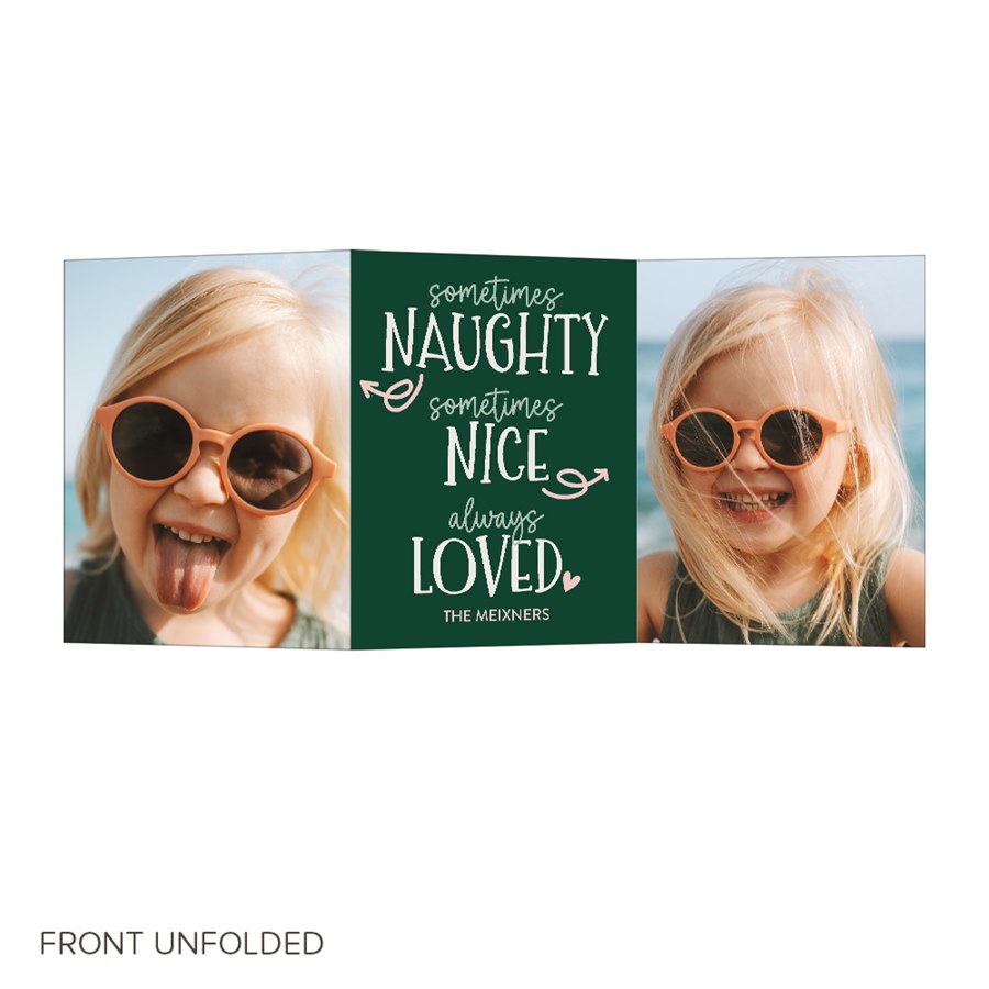 The Always Loved Christmas card adds a sweet and funny twist to your holiday greetings. The front features two photos paired with the phrase “Sometimes Naughty. Sometimes Nice. Always Loved,” with playful arrows pointing to your pictures. The trifold design gives you room for eight more photos and custom holiday text on the back. This creative photo Christmas card is a delightful way to celebrate the love at the center of your family’s story.
