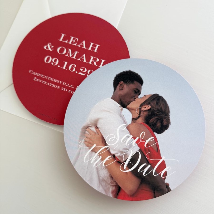 The Sweet Calligraphy save the date card brings playful charm to your wedding announcement. The round design centers your photo with “Save the Date” in a whimsical script font. All colors can be customized, making it easy to match your wedding palette. This stylish photo save the date card strikes the perfect balance between fun and elegant.