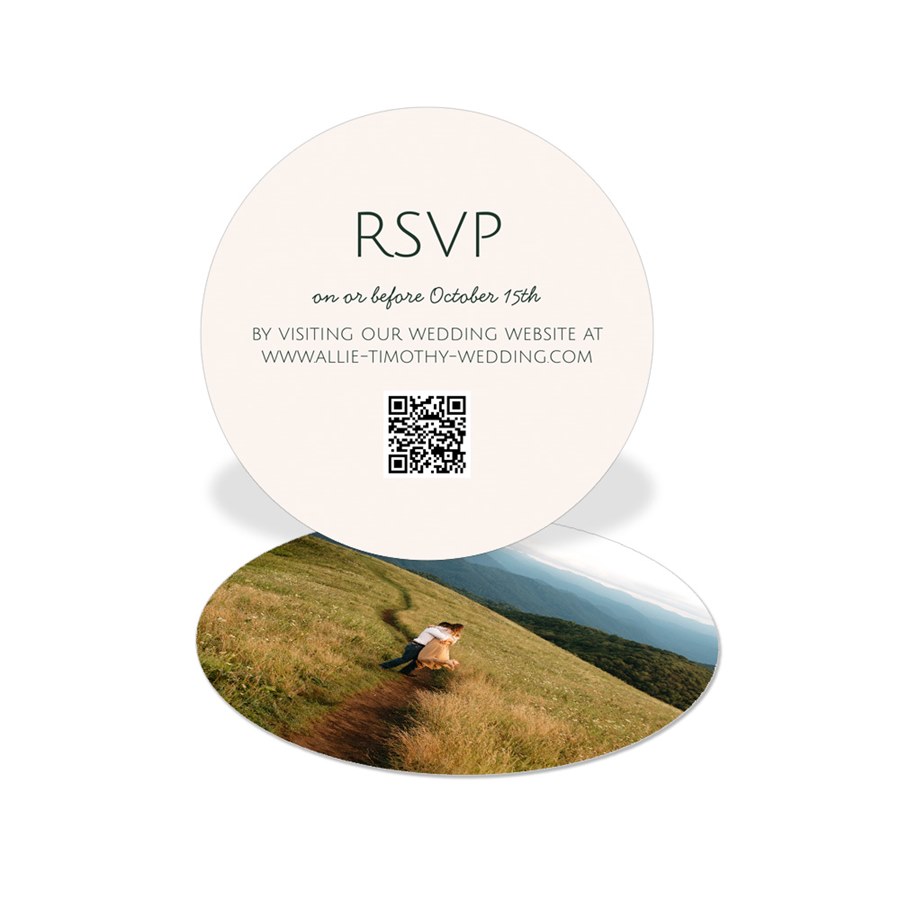 The Sweetly Scripted Wedding Insert Card offers a round design that’s both elegant and practical. Personalize fonts, text, and colors to coordinate with your invitation suite, and add a QR code for quick online responses. A photo on the back creates a personal finishing touch. Stylish and affordable, this RSVP card makes wedding planning effortless.