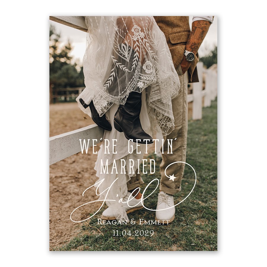 The Married Y'All wedding invitation brings southern charm to your big day with a full-photo front and the playful phrase “We’re Gettin’ Married Y’all!” in the color of your choice. This two-sided card includes customizable back templates, giving you space to share all your wedding details. Perfect for Texas weddings, rustic barn celebrations, or couples who love a casual vibe, this design sets the tone for a fun and memorable day.