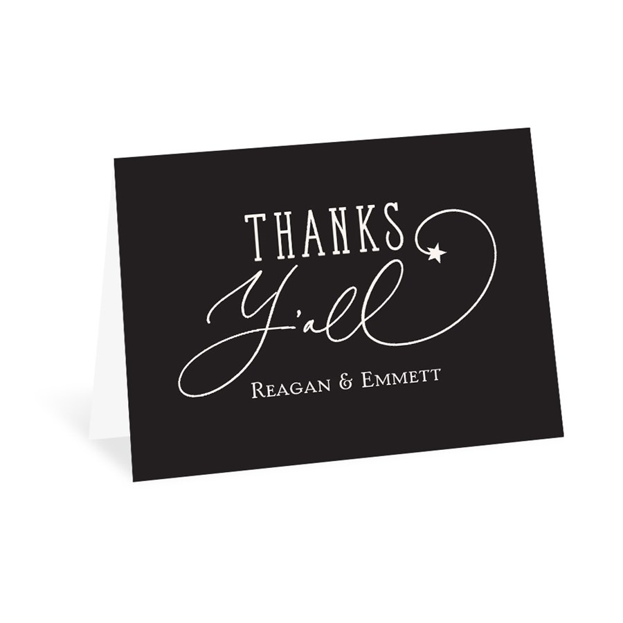 The Married Y'All thank you card features the fun phrase “Thanks Y’all” with customizable artwork colors and background options. This folded design allows you to add your own text and personal style, creating a card that’s both playful and heartfelt. A charming way to show appreciation, it completes your southern-inspired stationery suite.