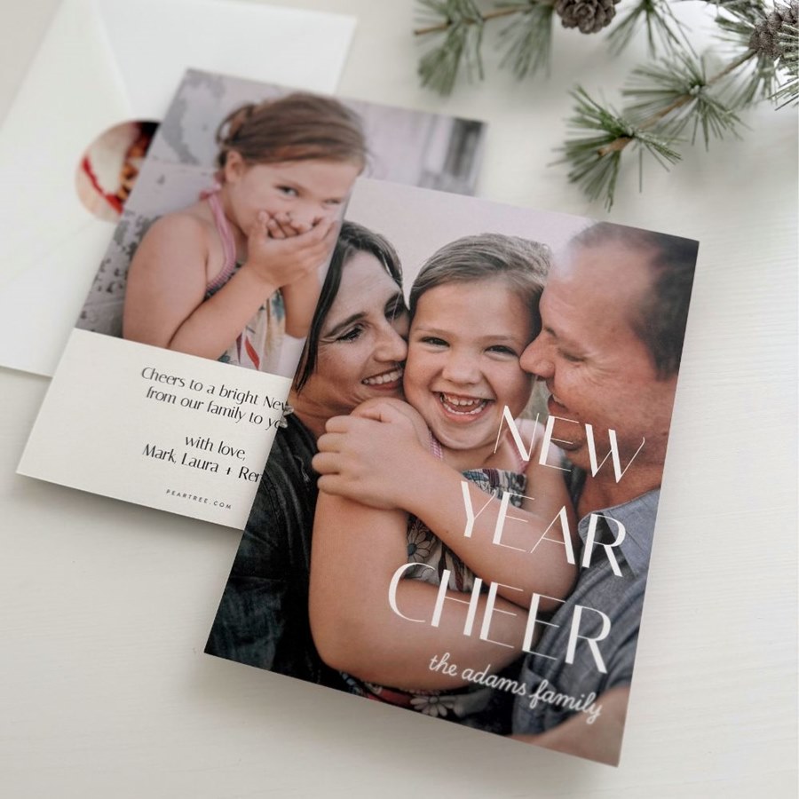 Ring in the new year with the Cheerful Year New Year Card, a full-photo design that lets your family’s personality shine. Add custom text to send New Year cheer, update the colors, and make it completely your own. This modern, two-sided card is perfect for sharing highlights from your year. Choose from a variety of back templates to personalize your greeting even further.