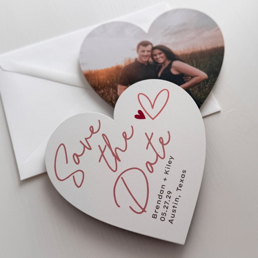 The Sweetheart Save the Date Cards capture your love story beautifully with heart accents and a modern handwritten font. Add your names, wedding date, and favorite photo for a design that’s full of personality. The heart-shaped die cut makes it extra special and unforgettable. Customize all colors and add a full-photo back for a romantic finishing touch.
