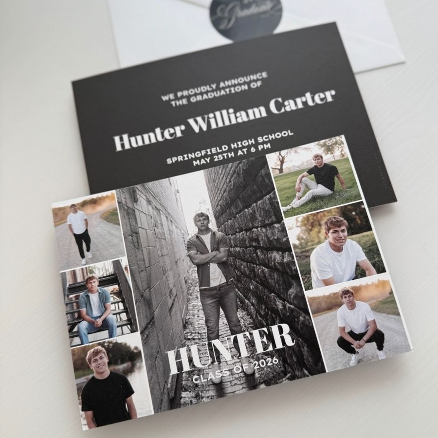 Share your senior’s story through a modern collage layout with The Grad Edit Graduation Announcements, which showcase seven favorite photos on the front. Every color can be customized so the design matches school colors or your grad’s go-to palette. The back includes versatile template options for more images or messages. These graduation announcements offer a stylish and heartfelt way to capture the moment.