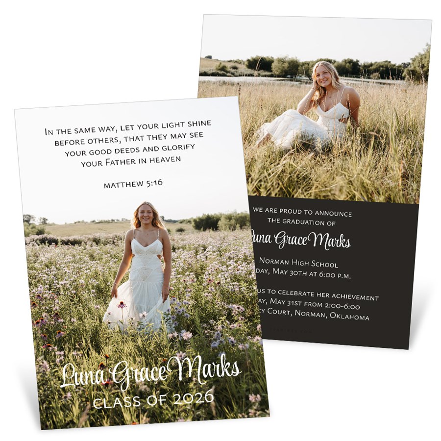 A favorite photo takes center stage on Shining Light Graduation Party Invitations, where you can also add meaningful custom text like a Bible verse. All colors and layout details can be adjusted to complement your image. The back includes template options for more photos, directions, or a note of thanks. These faith-inspired graduation invitations bring warmth and personality to your celebration.