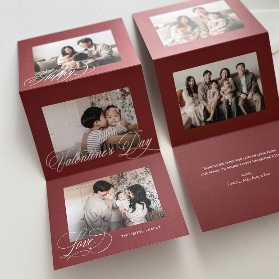 The elegant script and photo trio on Lovely Calligraphy Valentine’s Day Card make it a stylish choice for sharing love this season. This vertical trifold design lets you customize every color to suit your family photos. The back includes templates for extra images or a personal message. This beautifully scripted card adds sophistication to your Valentine’s Day greetings.