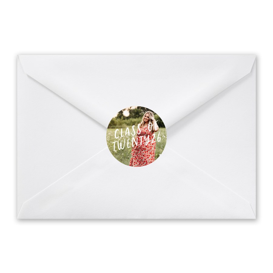 Your envelopes get a personal upgrade with the Lettered Grad Envelope Seals, which layer the “Class of Twenty26” lettering over your favorite photo. These round sticker seals let you adjust the wording color to perfectly match your grad’s style. They pair beautifully with photo graduation announcements or invitations. A custom seal like this adds a memorable, photo-forward touch to every envelope.