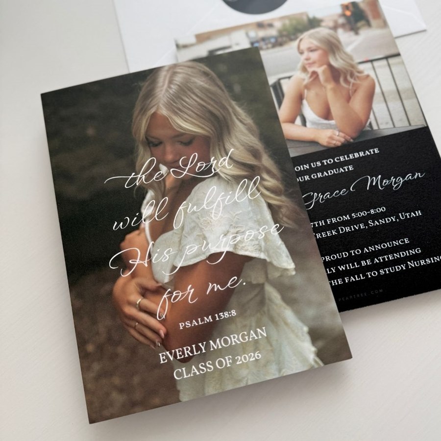 Designed for faith-centered grads, the Purpose Graduation Announcements feature a full photo front with space to include a meaningful Bible verse. You can update the color and placement of every text element to reflect your graduate’s personality. Back templates allow room for extra details or photos. These religious graduation party invitation beautifully combine personal style with spiritual inspiration.