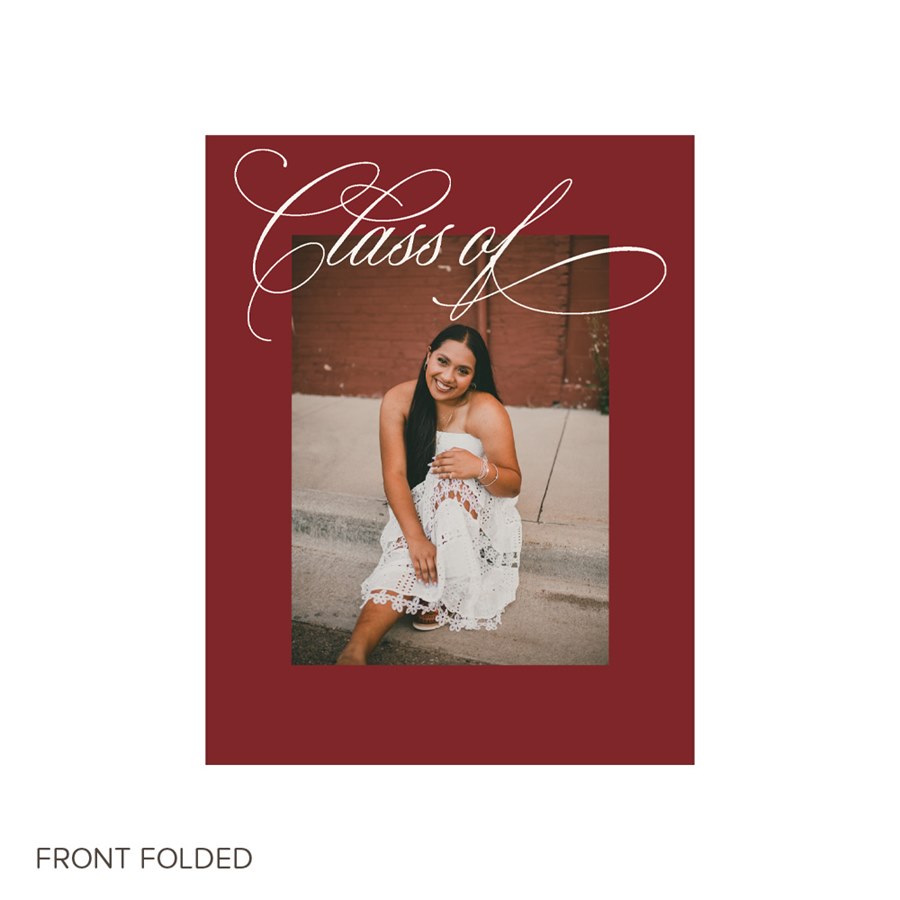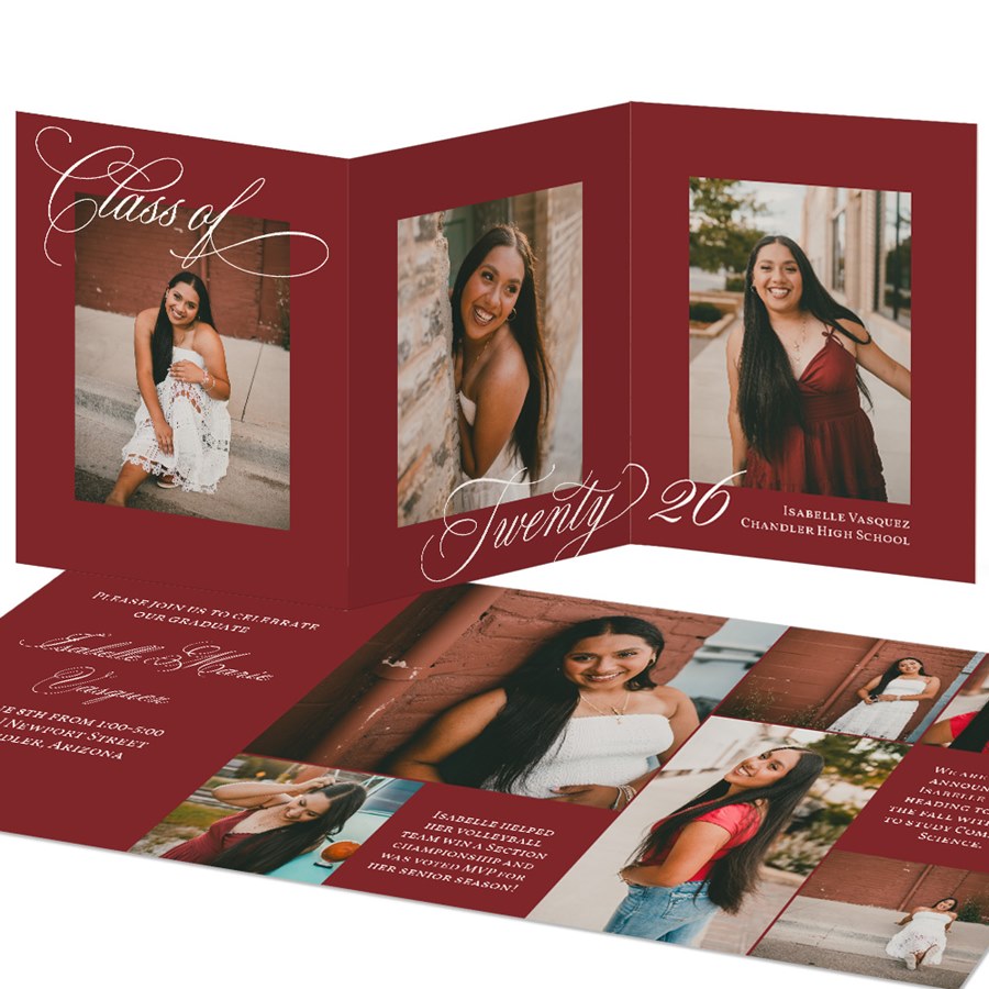 The Class Calligraphy Graduation Announcements combine classic script lettering with three standout photos on the trifold cover. You can customize all colors and add personalized text to create a timeless keepsake. The folded layout offers extra space on the back for more photos or information. These elegant script graduation announcements are perfect for showcasing your grad with refined style.