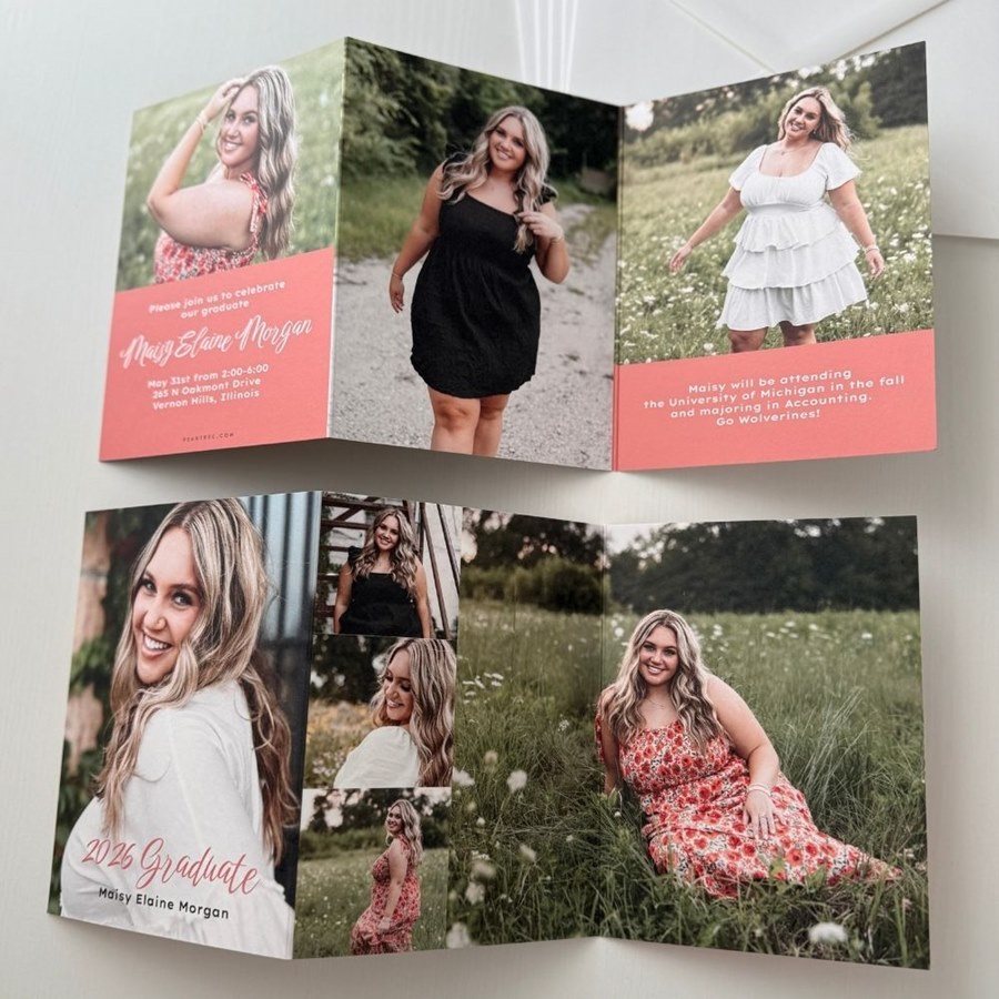 The Photo Filled Graduation Invitations create a bold visual statement with five standout photos arranged across a trifold format. All colors and text can be updated for a fully personalized look. The spacious folded design includes extra template options for the back panels. These collage-style graduation invitations are ideal for grads who want a vibrant, photo-forward invitation.