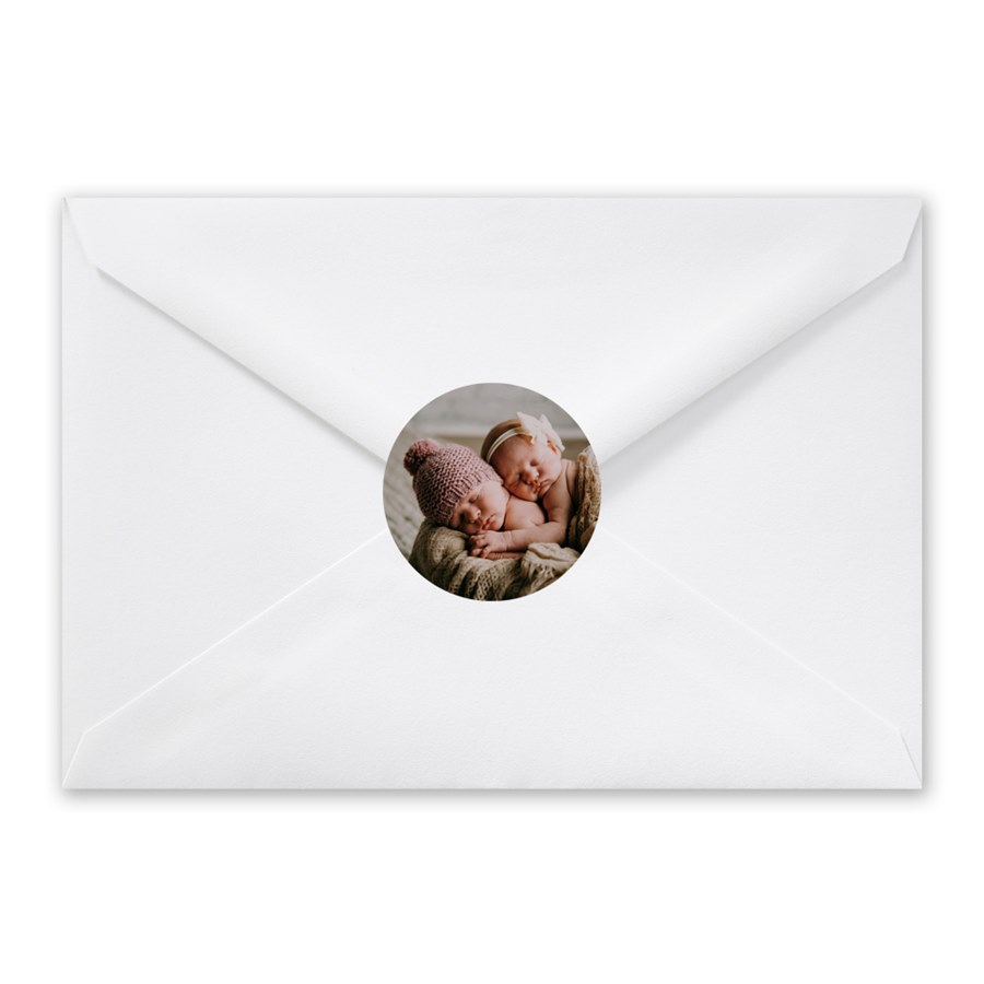 A clean, modern touch finishes your envelopes with the Double Image envelope seals, printed as a full round photo. These circle stickers work beautifully for announcements, invitations, and birth stationery. Perfect for twins, babies, or any sweet moment captured on camera. A simple and personalizing envelope detail.