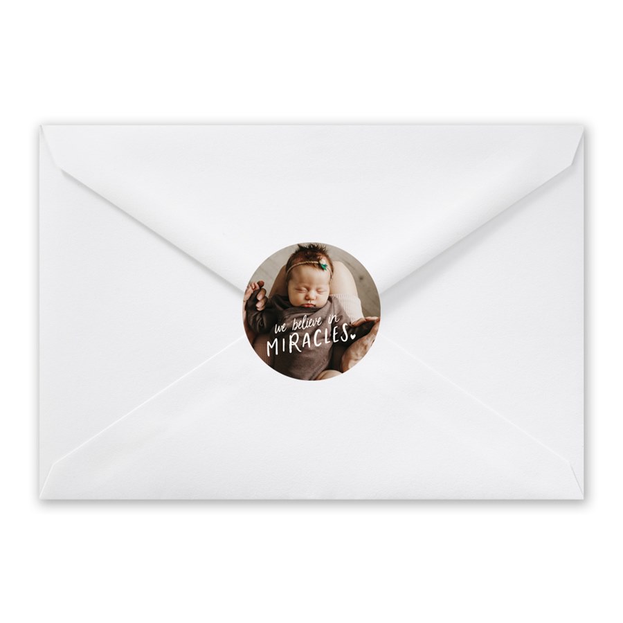 A heartfelt message overlays your full photo on these Miracles envelope seals, featuring “We believe in Miracles” in the color of your choice. Personalize the design to pair perfectly with baby announcements or shower invites. These round stickers add warmth to every envelope. A sweet detail for celebrating your little miracle.