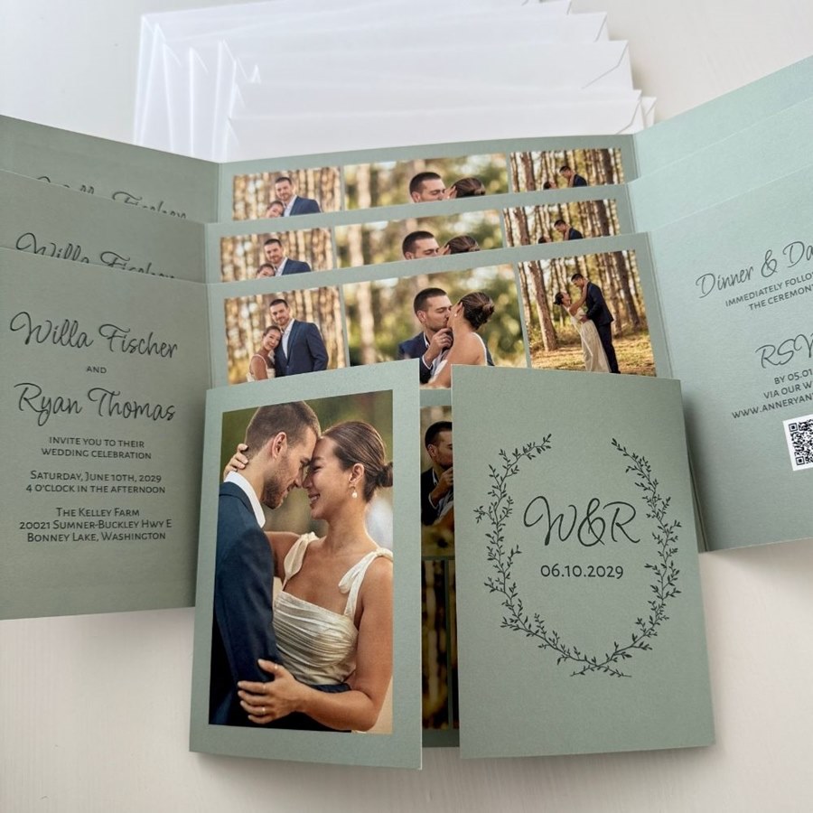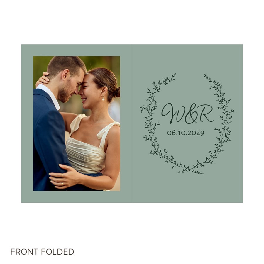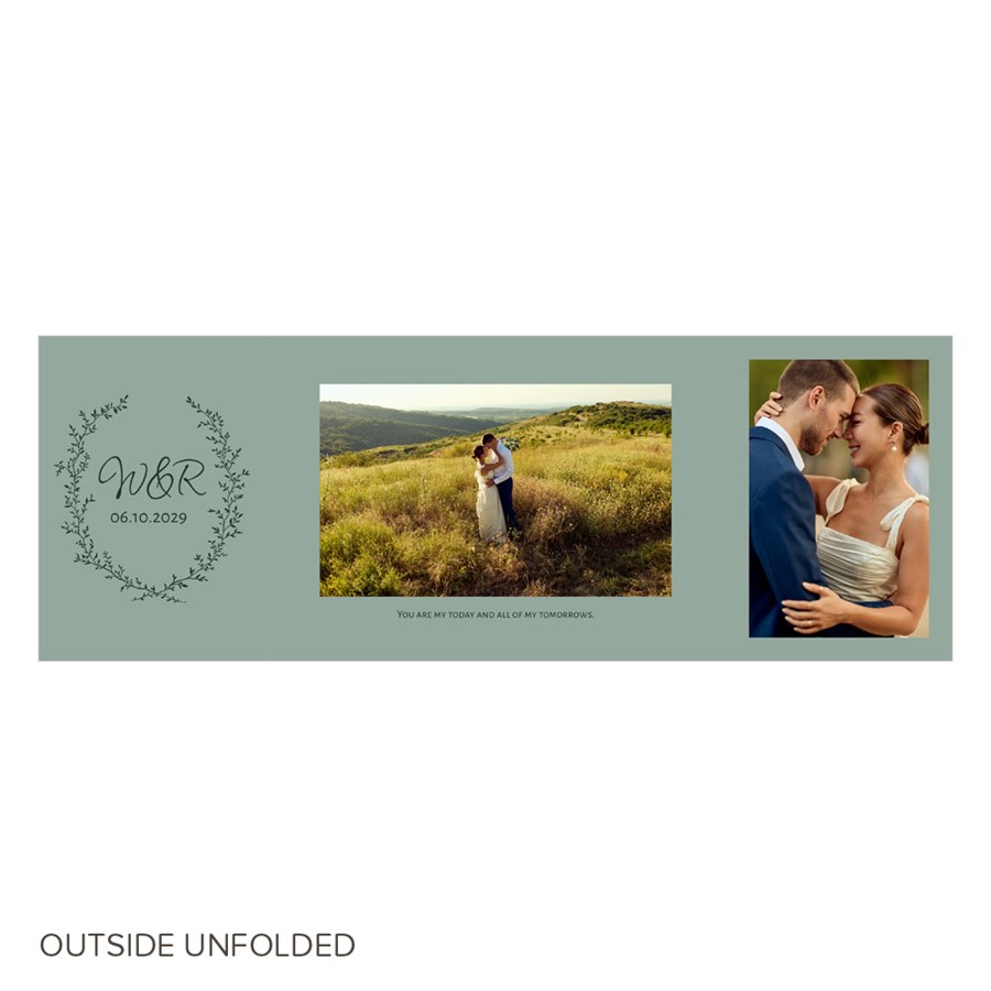 Honor your love story with the Forever Wed Wedding Invitation, featuring greenery artwork and a romantic wreath framing your initials and wedding date. This photo gatefold invitation includes a layout for multiple pictures inside, along with your wedding details on each panel. Customize every color to match your wedding palette and add a QR code for easy digital RSVPs. A final photo on the back completes this elegant greenery wedding invitation.