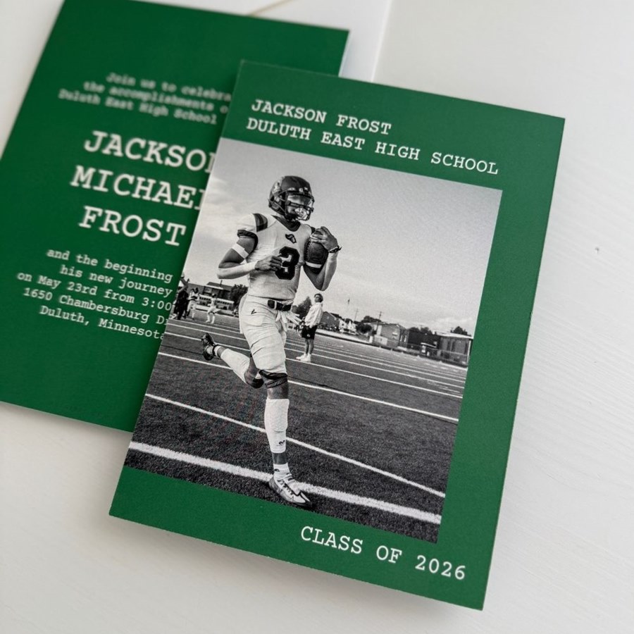 Step into the future with Next Level Graduation Announcements, a clean and modern design that puts your graduate front and center. The front features one standout photo paired with your graduate’s name and custom text, all set against a background color you can fully personalize. Every color in the design can be updated, making it easy to coordinate with school colors, party décor, or athletic themes like football and sports achievements. Printed flat and two-sided with customizable back templates, this graduation announcement delivers a bold yet versatile look for celebrating what’s next.