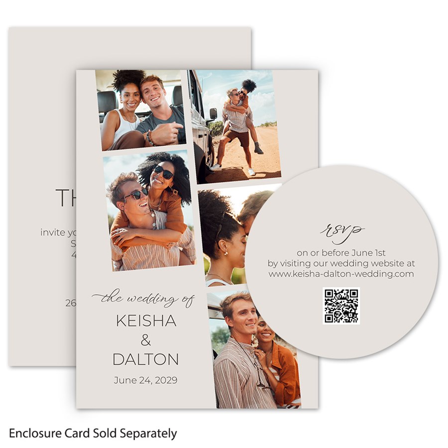 The Photo Booth Wedding Invitation is a modern, playful design inspired by vintage film strips. The front features five of your favorite photos lined up in a stylish collage, paired with your custom text for a personalized look. The back gives you additional layout options and customizable colors so your design feels one-of-a-kind. Affordable and creative, this flat wedding invitation is perfect for couples who want their photos to be the star of the show.