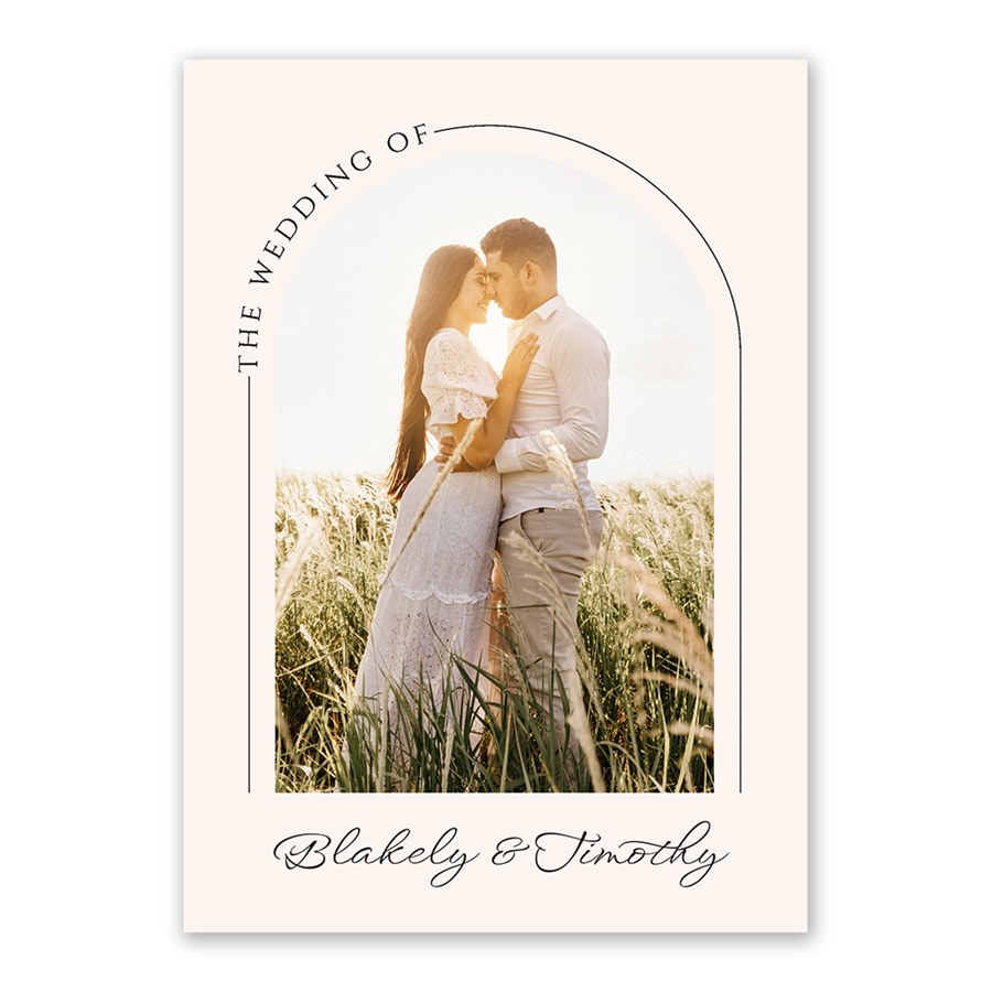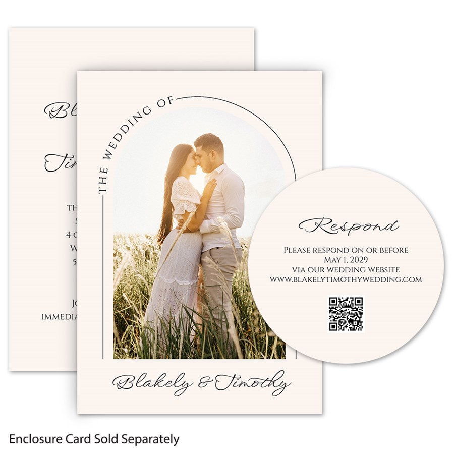 The Surrounded by Love Wedding Invitation features your favorite photo framed by a graceful arch border, creating a modern yet timeless design. The top of the arch features the words, "The Wedding of" in a modern font. Customize the colors, fonts, and layout to complement your wedding palette and personal style. Coordinating RSVP cards make it easy to build a matching invitation suite.