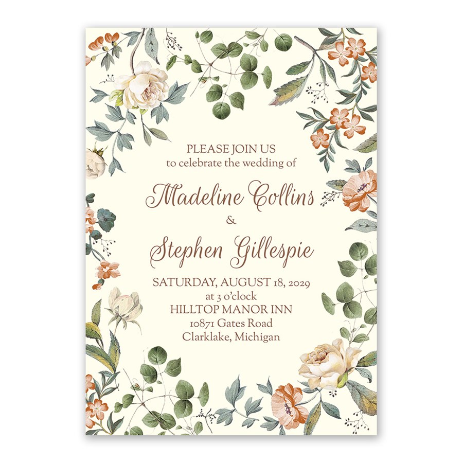 The Bordered in Blooms Wedding Invitation bursts with floral beauty, featuring a lush mix of colorful and neutral blooms. Customize the background, flower colors, and fonts to create a design that perfectly fits your wedding palette. This affordable, two-sided invitation combines timeless floral elegance with modern personalization. Complete your stationery suite with coordinating RSVP and thank you cards from the In Bloom collection.
