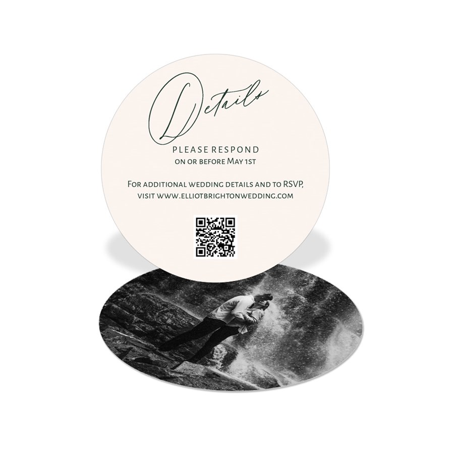 The Enchanted Love Wedding Insert Card adds a touch of classic romance to your wedding stationery. Featuring the word “Details” in an elegant script font, this round design can be customized with your favorite colors and fonts. Add a QR code for convenient digital RSVPs and a full photo on the back for a personal touch. It’s a perfect match to your Enchanted wedding invitations.