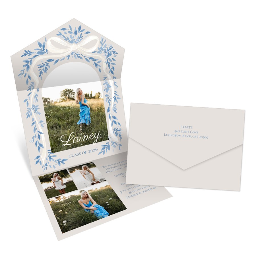 A sweet, nature-inspired design makes the Sweet Bow Seal & Send Graduation Announcements a standout for any celebration. This Seal & Send style is envelope-free, giving you an all-in-one graduation announcement that’s as convenient as it is pretty. Inside, four photos surround an arched main image framed with delicate greenery artwork and a charming white ribbon bow. Customize the leaf colors, background shades, and all wording to create an arched graduation announcement that feels perfectly tailored to your graduate.