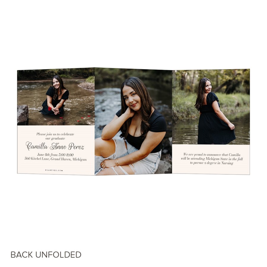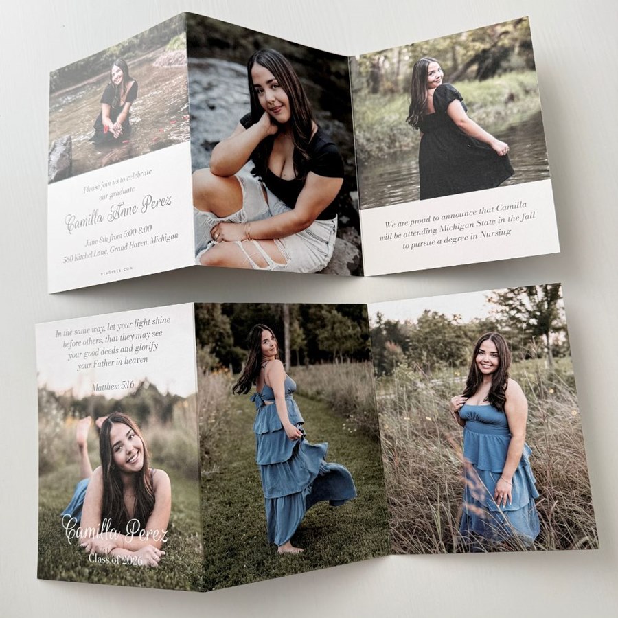 A meaningful and faith-based design shines through in this A Shining Light Graduation Announcements. This trifold graduation announcement includes three full photos on the front, along with space for custom wording such as a favorite Bible verse. The back offers additional photo layouts and room for graduation party details, making it both beautiful and practical. With customizable colors and text, this religious graduation announcement becomes a keepsake worth sharing.