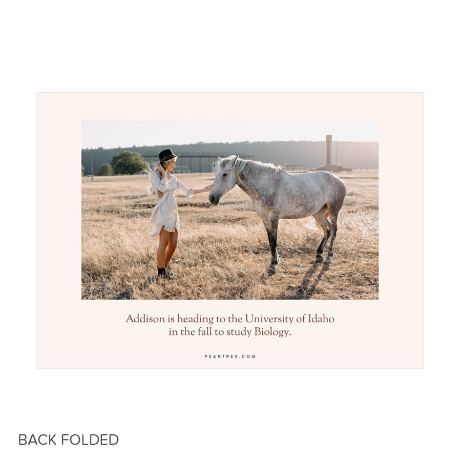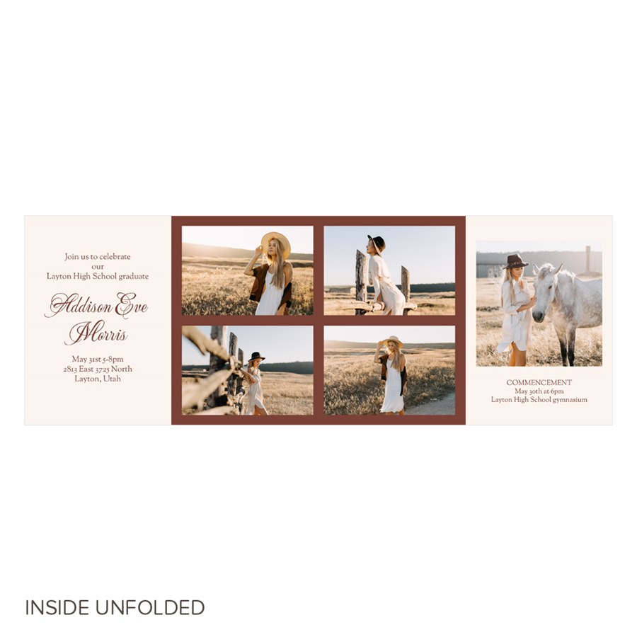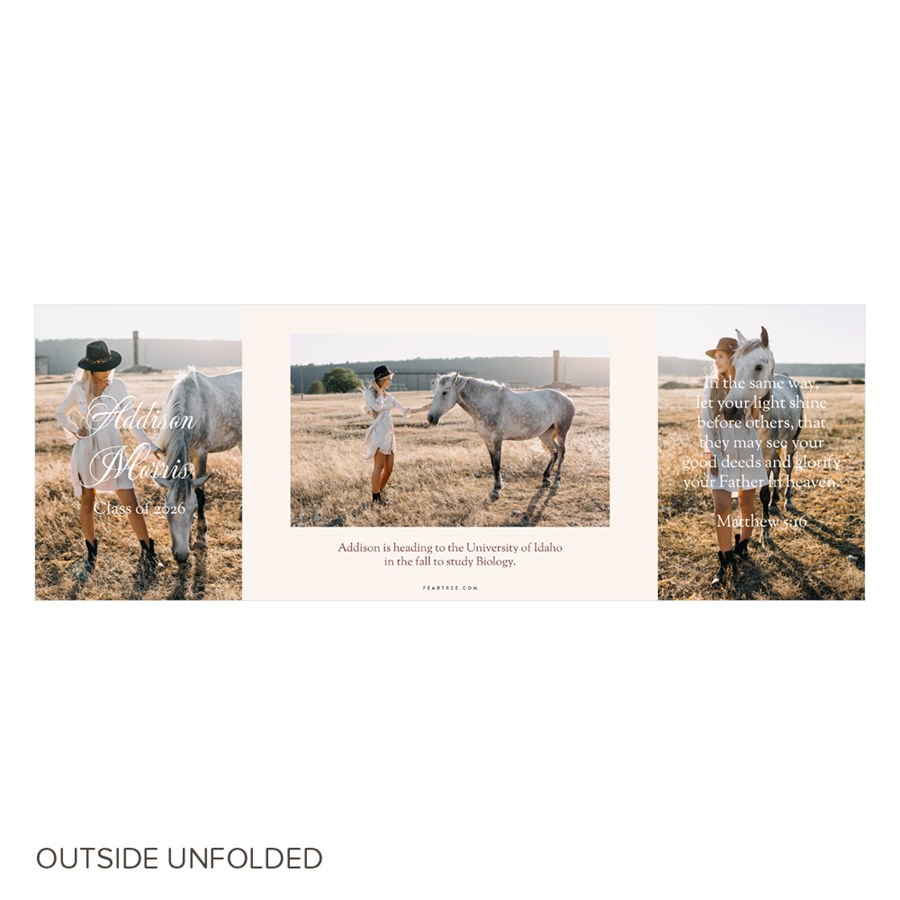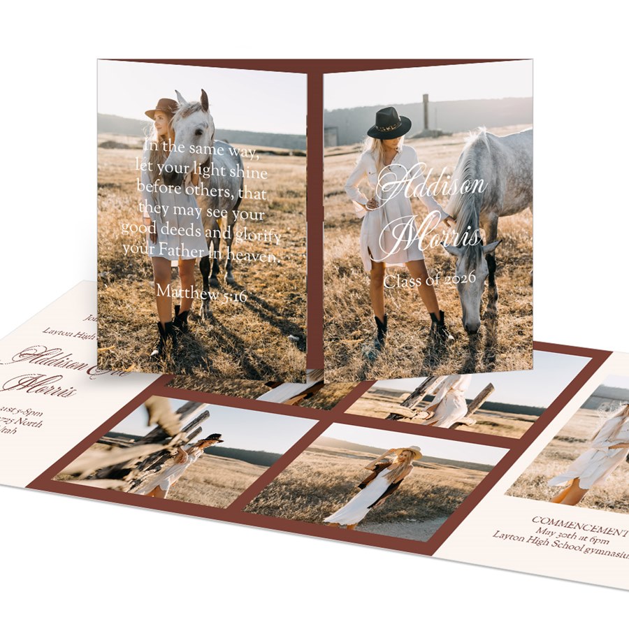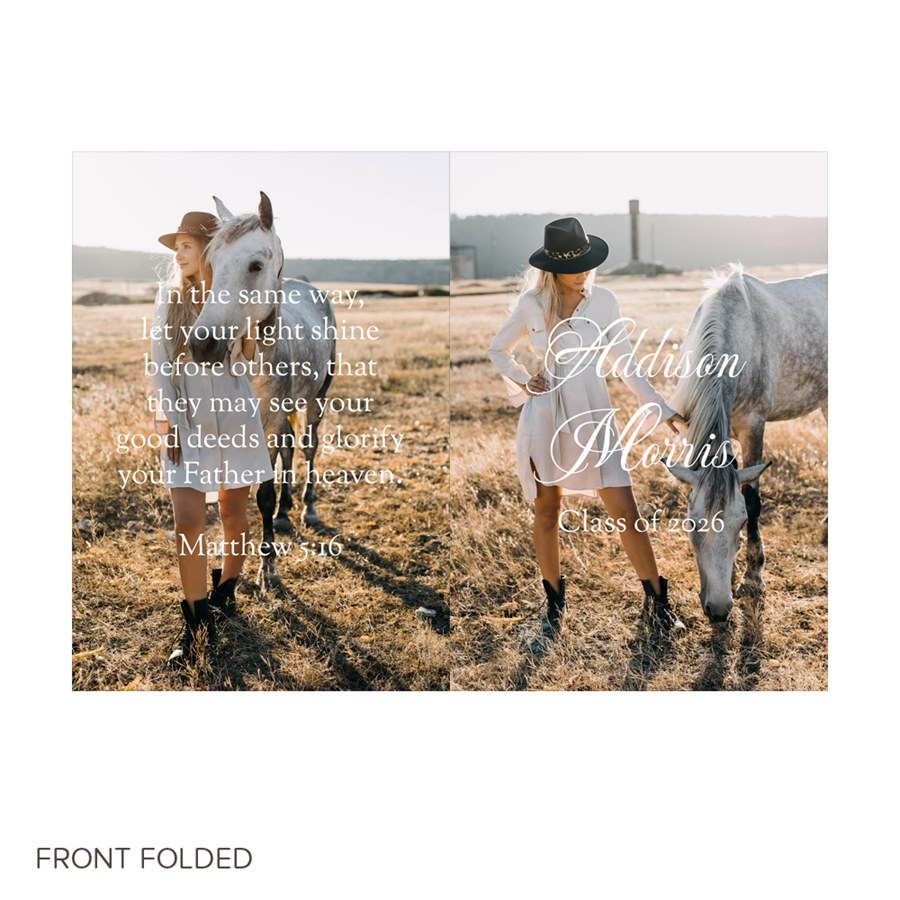 Make faith and achievement shine with the Shining Graduate Graduation Party Invitations, designed to highlight what matters most. The front features two photos with custom text printed directly over the images, including space to add the graduate’s favorite Bible verse. Inside, guests will see a five-photo collage and party details, with an additional full-photo panel on the back. This folded religious graduation announcement offers customizable background and text colors for a meaningful, personal touch.