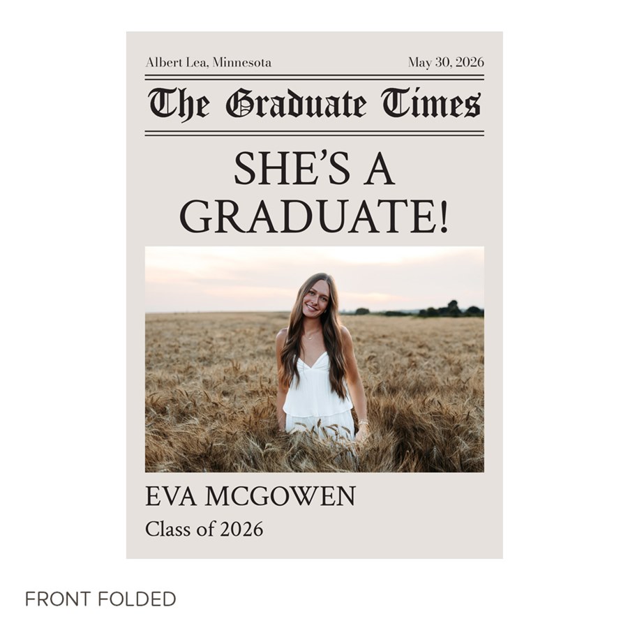 Turn your graduate’s big achievement into front-page news with a vintage-inspired design, the Grad News Graduation Announcements are full of personality. This side-fold, two-sided announcement features “The Graduate Times” in a classic newspaper font, a front-page photo and headline text, plus four photos with captions inside. The back includes space for an additional photo and custom wording, such as a favorite Bible verse or meaningful message. Fully customizable background, text, and line colors make this folded graduation announcement feel truly one of a kind.